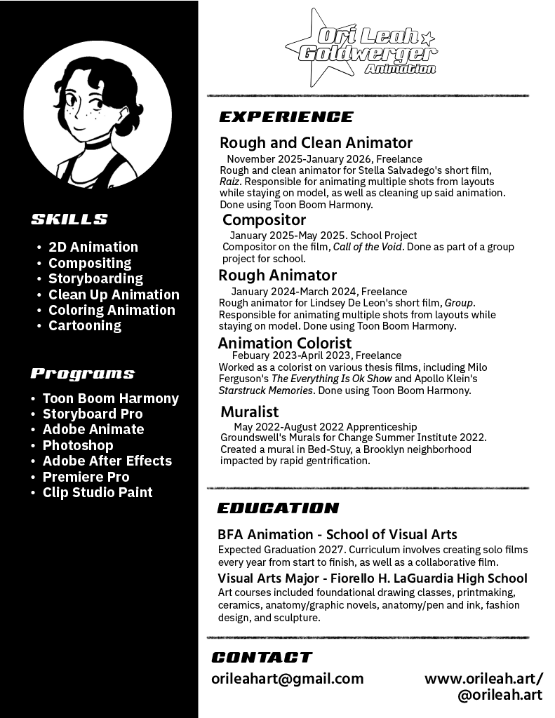 Ori Leah Goldwerger is an animator based in New York City, where she is currently pursuing a BFA in Animation at the School of Visual Arts. She has dedicated her life to telling stories within the animated format, with an emphasis on action and emotional beats. When not animating, she can be found at her local comic book store or playing the Sims.
